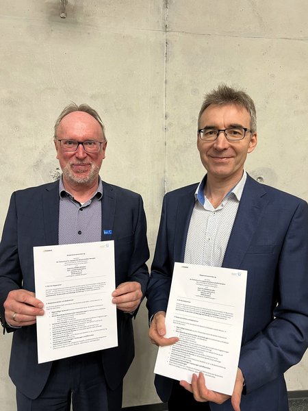 Foto: Prof. Dr. Wolfgang Hauke, Präsident der Hochschule Kempten (links) und Gregor Friedrich, Direktor der FOSBOS Kempten schließen offizielle Schulkooperation. Bildnachweis: Hochschule Kempten/S. Adamer