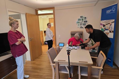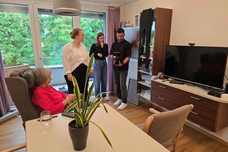 In Zusammenarbeit mit dem Bayerischen Zentrum Pflege Digital (BZPD) erstellt das Landratsamt Oberallgäu derzeit einen Imagefilm zur Plattform PIO-Oberallgäu. Die Dreharbeiten fanden Anfang Juni im AAL Living Lab der Hochschule Kempten statt. Als Darstellerin der pflegesuchenden Seniorin konnte eine Vertreterin der SilverScientists gewonnen werden, einer Gruppe, die sich mit den Chancen, Zwängen und Herausforderungen der Digitalisierung im Alltag von Seniorinnen und Senioren befasst hat und aus einem partizipativen Bürgerprojekt der Fakultät Soziales und Gesundheit entstanden ist.