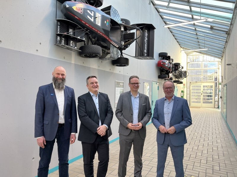 Foto: Neu gestalteter Gang der Maschinenhalle an der Fakultät Maschinenbau der Hochschule Kempten – v. l. n. r.: Prof. Dr. Martin Schirra, Dekan der Fakultät Maschinenbau, Christian Könitzer, Vorsitzender des VDI-Bezirksvereins Augsburg, Prof. Dr.-Ing. Gregor Bischoff, Faculty Advisor des Infinity-Racing-Teams sowie Hoch-schulpräsident Prof. Dr. Wolfgang Hauke; Bildnachweis: Hochschule Kempten/Sybille Adamer