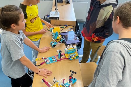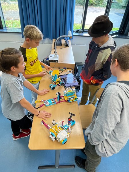 „Zum eingestellten Zeitpunkt ist es sonnig“, tönt es aus dem Tablet. Der kleine, über Bluetooth verbundene Roboter hat soeben das Wetter über Farbsensoren vorhergesagt. Und er kann noch mehr, zum Beispiel Hindernisse während der Fahrt erkennen und überwinden. Stolz zeigen die Schüler der Klassen 6a, 6b und 8a, was sie in den bisherigen fünf Doppelstunden gemeinsam mit Kursleiter Daniel Schaffner ausgetüftelt haben. Zunächst ging es für die 16 Schülerinnen und Schüler des Wahlkurses darum, dass umfangreiche Material aus den zehn Lego-Robotik-Sets zu sortieren und die Sensoren kennenzulernen, die auf Farben, Neigungswinkel und Abstände reagieren. Die Sets haben einen direkten Lehrplanbezug der MINT-Fächer für die weiterführende Schule. „Die erste Challenge war dann ein kleines Wettrennen“, kommentiert Schaffner ein kurzes Video, in dem kleine Roboter über den Flur flitzen und vereinzelt auch mal einen ungeplanten Überschlag machen.