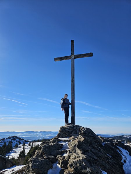 Foto 2: Eine Kemptener Mitarbeiterin am Gipfelkreuz des Großen Arbers während der Schneeschuhwanderung; Bildnachweis: Bernd Ottow