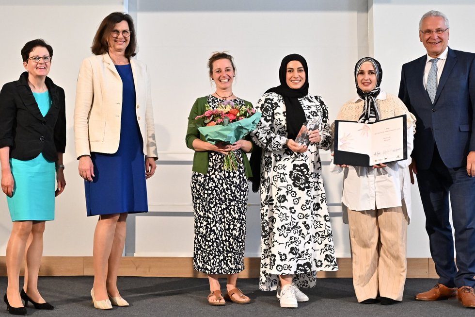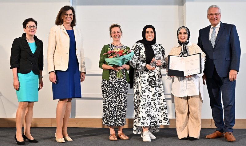 Foto: Projektverantwortliche des SmF bei der Verleihung des Bayerischen Integrationspreises mit Landtagspräsidentin Ilse Aigner und Joachim Herrmann, Bayerischer Staatsminister des Innern, für Sport und Integration. Bildnachweis: Fotoarchiv Bayerischer Landtag
