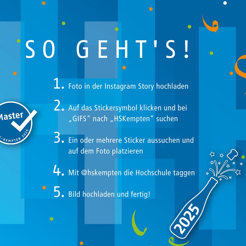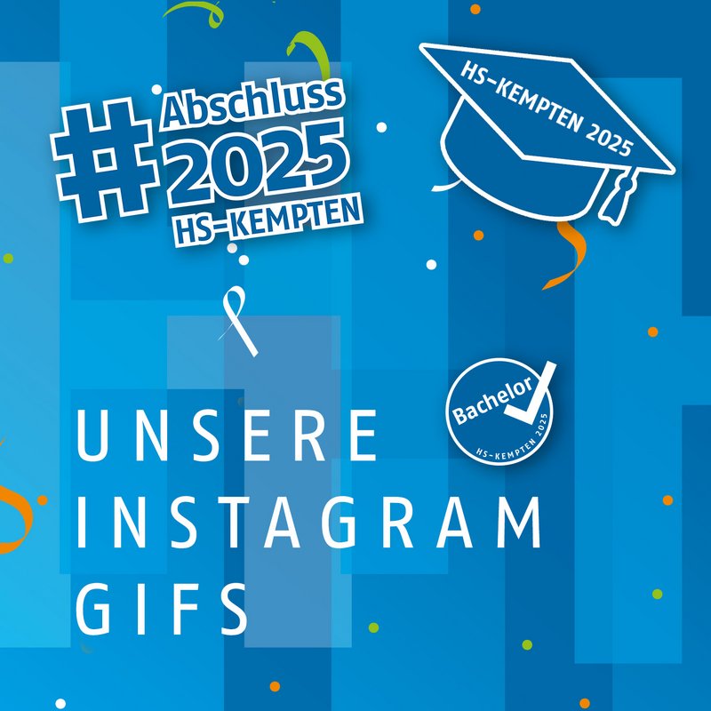 Wir möchten Sie alle sehen! Feiern Sie sich und Ihren Jahrgang auch auf unserem Instagram-Kanal. Präsentieren Sie sich entweder allein, zu zweit, gerne auch in der Gruppe als stolzer Bachelor oder Master der Hochschule Kempten. Teilen Sie Ihren Erfolg mit uns und der Welt. Unsere speziellen Studienabschluss-Gifs stehen ab Mitte September für Sie bereit.