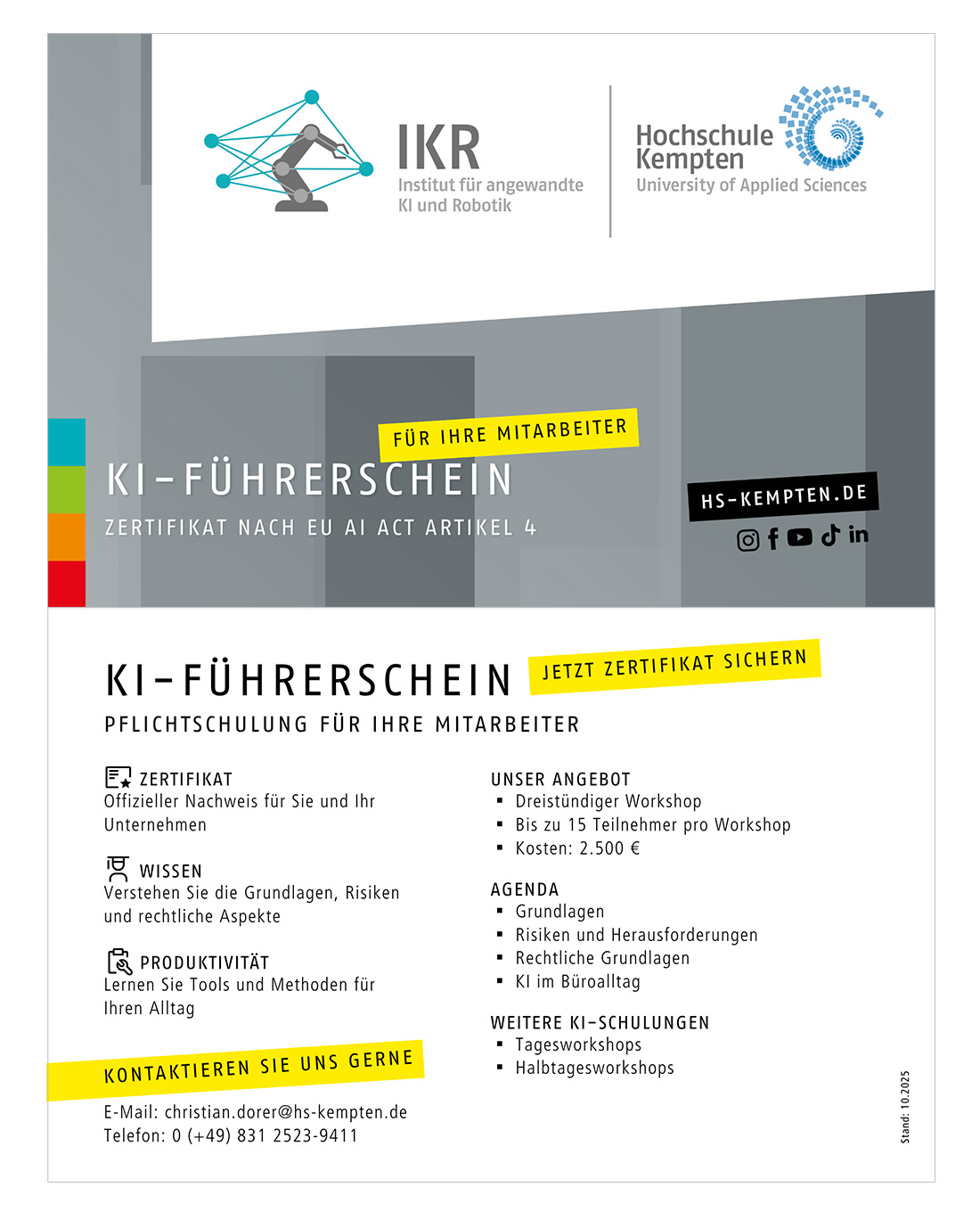 Der KI-Führerschein ist eine praxisorientierte Grundlagenschulung, die Mitarbeitende befähigt, Künstliche Intelligenz kompetent, sicher und verantwortungsvoll einzusetzen. Ziel der Schulung ist es, ein fundiertes Verständnis für Funktionsweise, Chancen und Risiken von KI zu vermitteln und die Basis für deren verantwortungsvolle Nutzung im Berufsalltag zu schaffen.