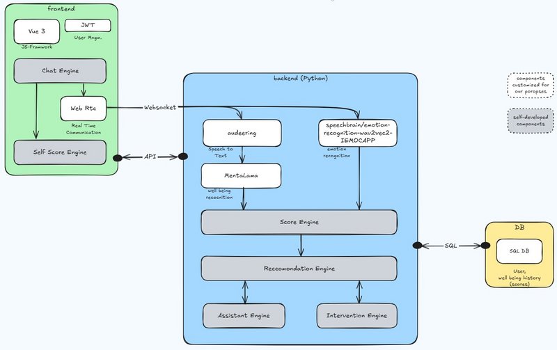 Das System kombiniert fortschrittliche Sprach- und Textanalysen mit regelmäßigen Selbstbewertungen und liefert so ein umfassendes Bild des Wohlbefindens der Nutzenden. Bei Bedarf generiert die Plattform personalisierte Empfehlungen oder leitet gezielte Interventionen ein – ideal für den Einsatz in Pflegeeinrichtungen und im häuslichen Umfeld.
