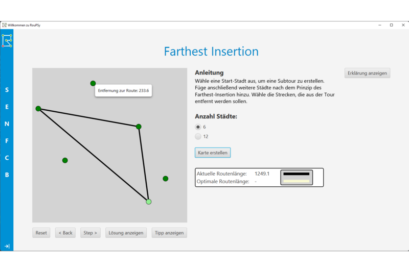 RouPSy ist eine Lernumgebung, die Studierenden helfen soll, verschiedene Lösungsverfahren des Traveling Salesman Problems zu verstehen und anhand zufällig generierter Beispiele zu üben und zu vertiefen. Das Programm unterstützt den Lernprozess des Users durch Rückmeldung zu seinen Aktionen: Hinweise auf Fehler, Tipps zum nächsten Schritt oder das Anzeigen der nächsten Schritte oder der Gesamtlösung. Hierbei lernt der User auch, wie sich die Näherungsverfahren von exakten Lösungen unterscheiden. Auch exakte Lösungsverfahren werden in der Anwendung erklärt und dem User näher gebracht.