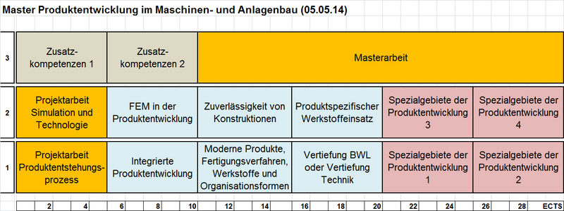 Der Masterstudiengang Produktentwicklung im Maschinen- und Anlagenbau hat eine Regelstudienzeit von drei Semestern mit insgesamt 90 ECTS Credits. Er kann aber auch in Teilzeit mit einer Regelstudienzeit von sechs Semestern absolviert werden.