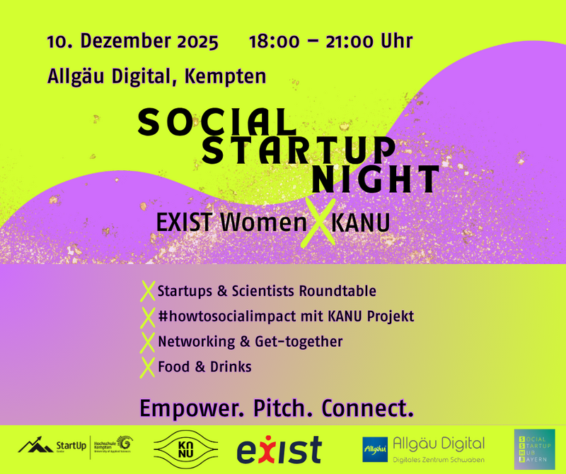 Am 10. Dezember 2025 laden EXIST Women und das KANU Projekt zur Social Startup Night ins Allgäu Digital in Kempten ein.