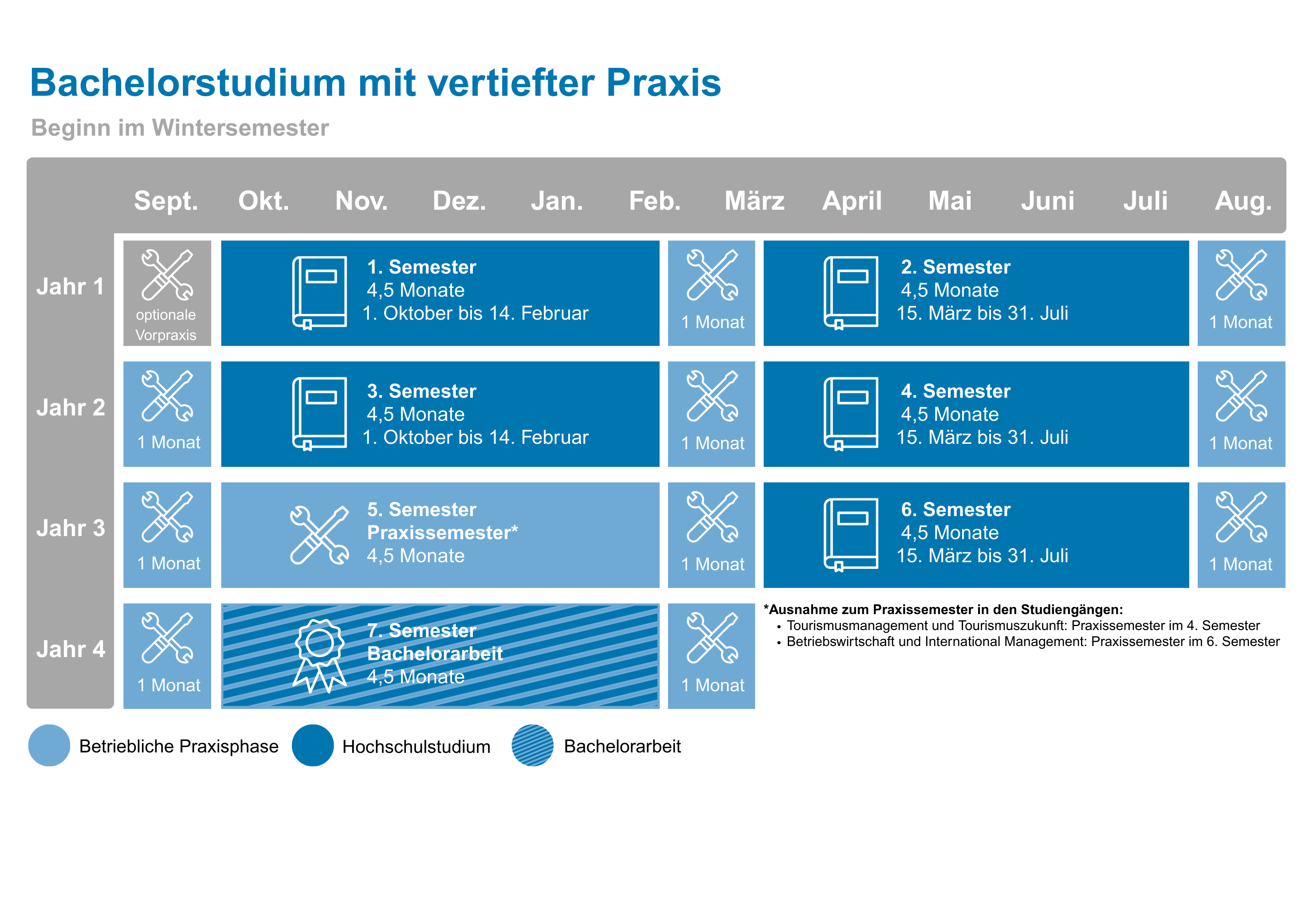 Das Bachelorstudium mit vertiefter Praxis zeichnet sich durch einen fortlaufenden Wechsel zwischen Hochschul- und Praxisphasen aus.