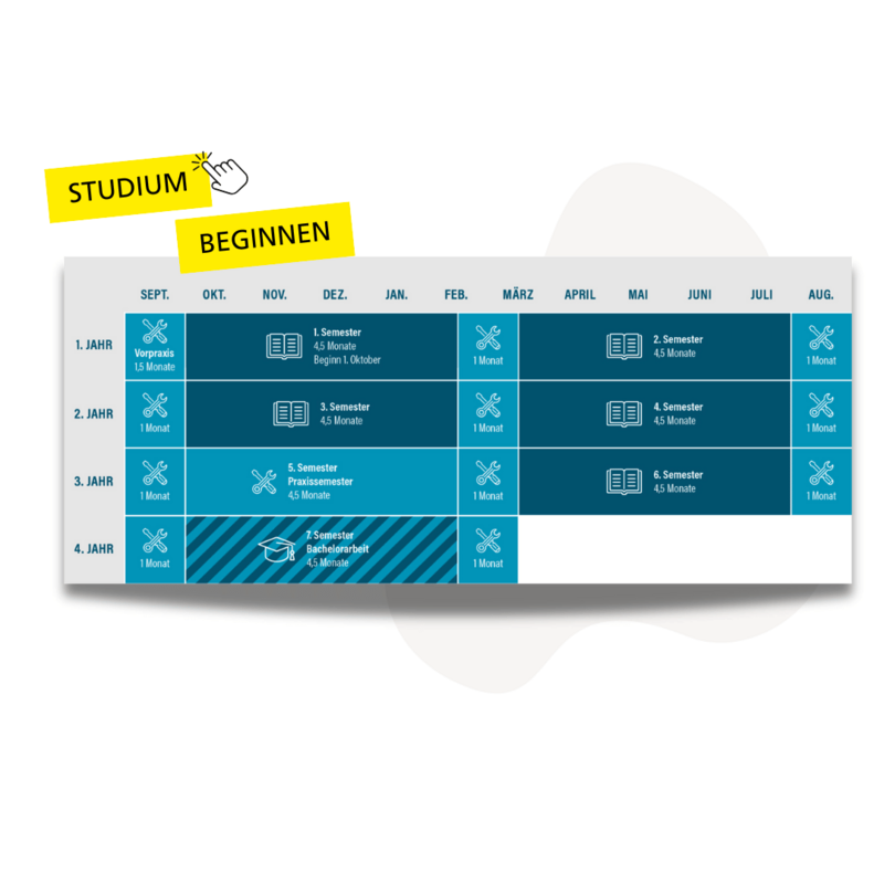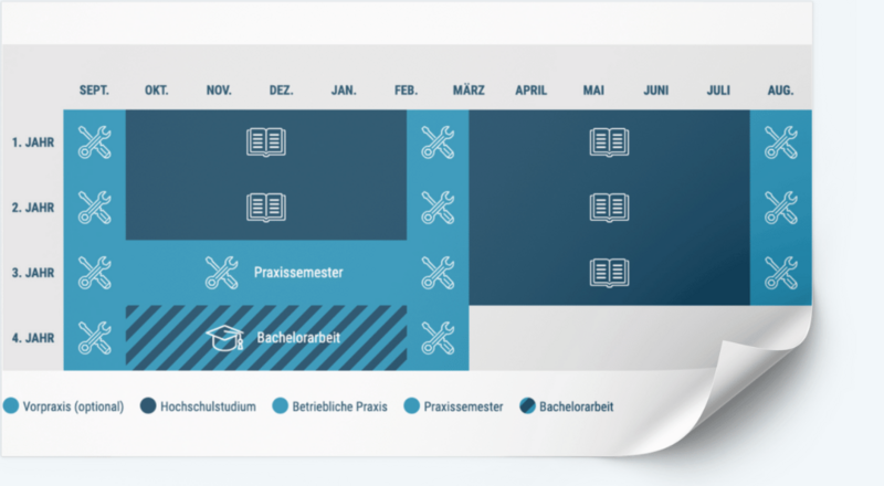 Jeweils am 01. Oktober startet dein Bachelorstudiengang an der Hochschule mit intensiven Praxisphasen im Praxispartner-Unternehmen, die eng an die Studieninhalte angelehnt sind (siehe Studienplan).