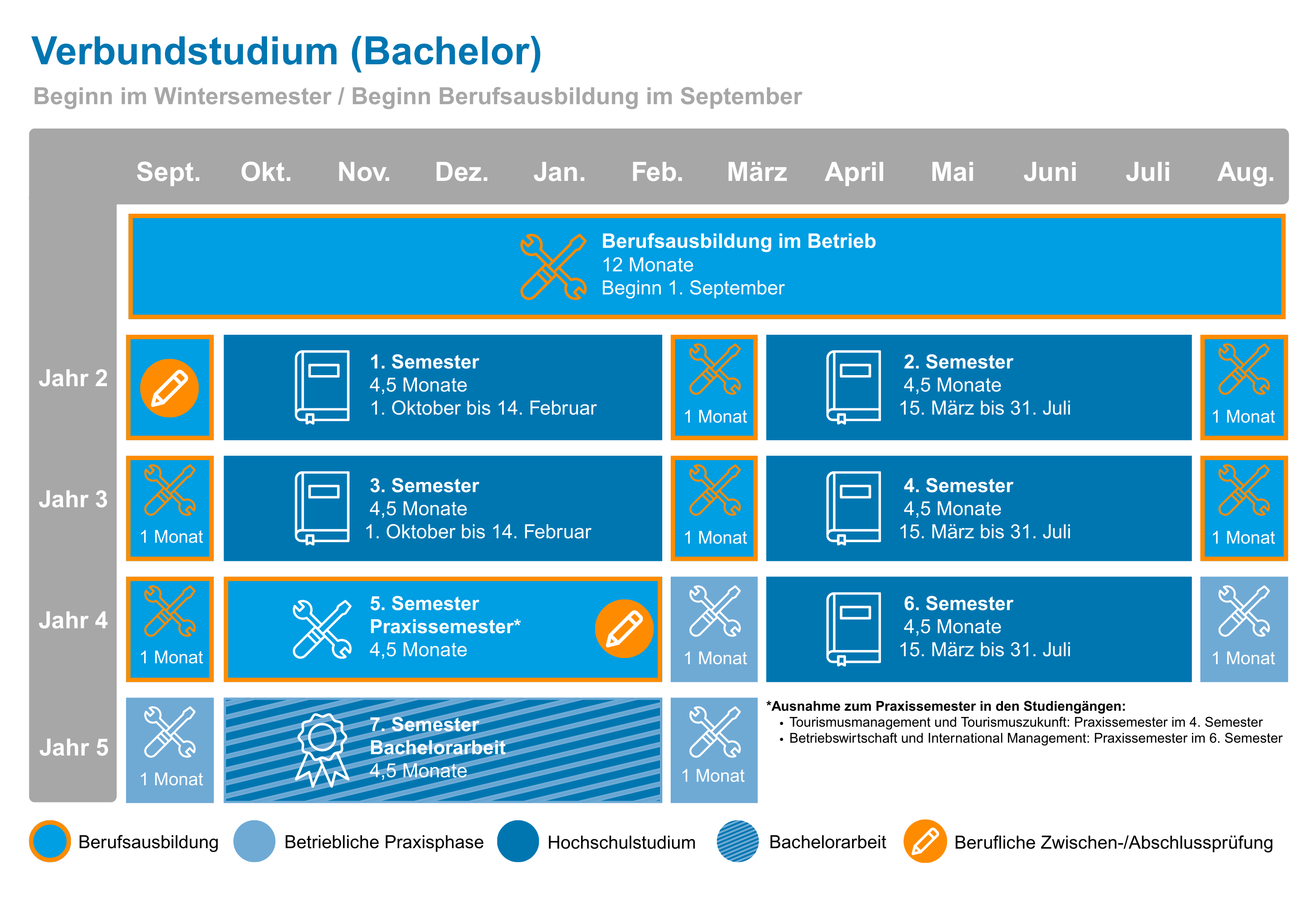 Die Praxisphasen finden dabei überwiegend in den vorlesungsfreien Zeiten statt, je nach Unternehmen wird auch eine gewisse Arbeitszeit während der Vorlesungszeit absolviert.