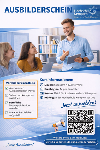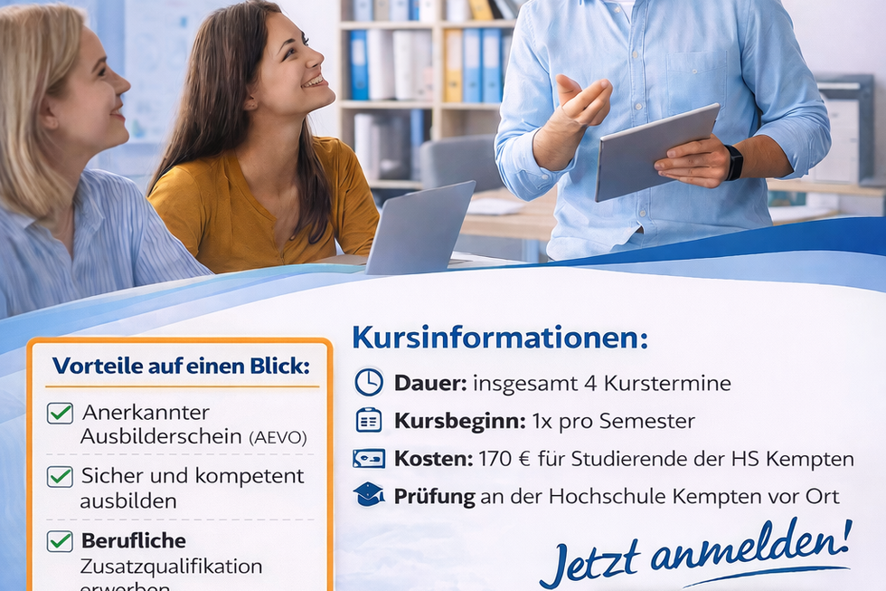 möchten Sie Ihre beruflichen Chancen erweitern und später selbst Auszubildende ausbilden? Dann nutzen Sie die Möglichkeit, den Ausbilderschein (AEVO) direkt an der Hochschule Kempten zu erwerben.